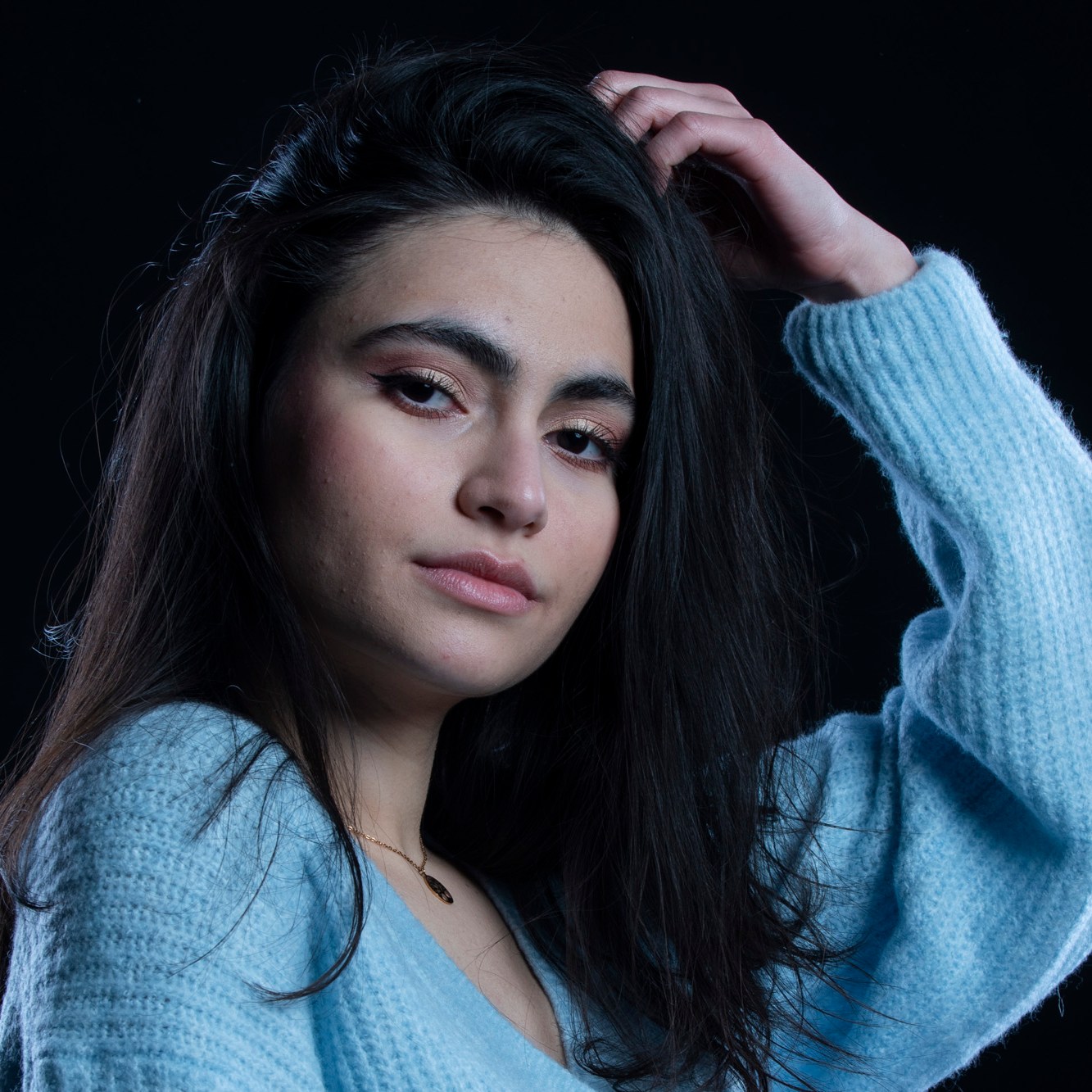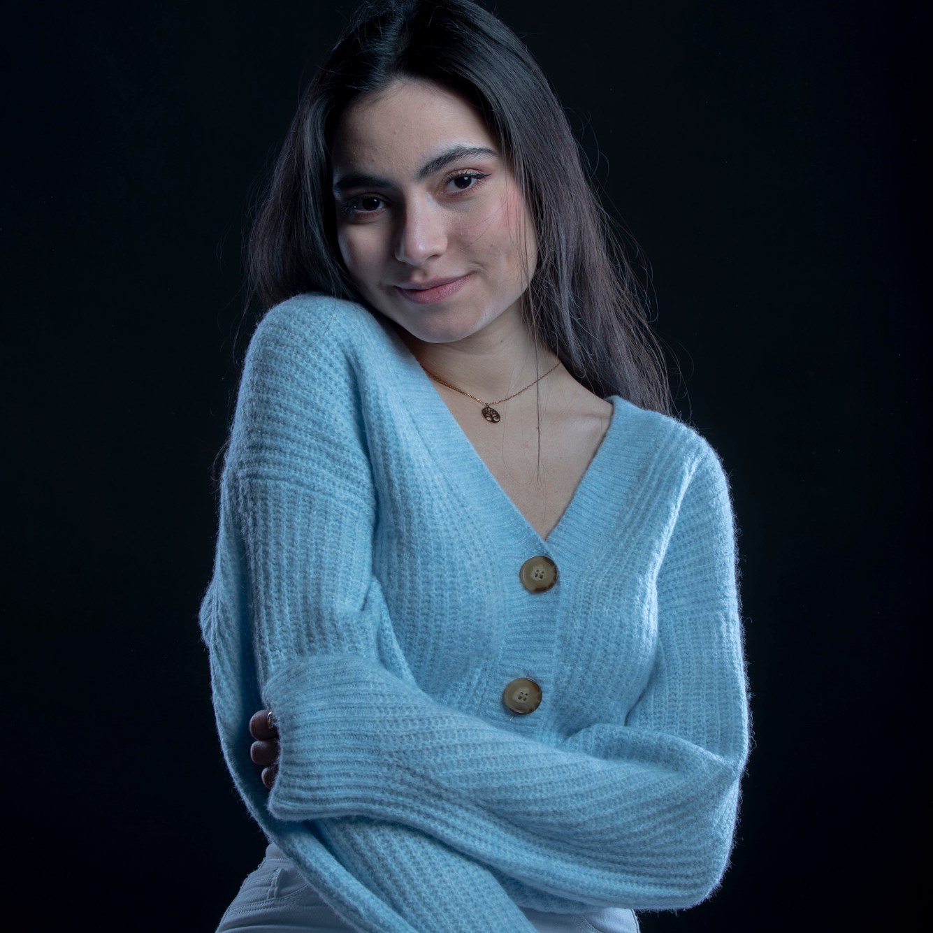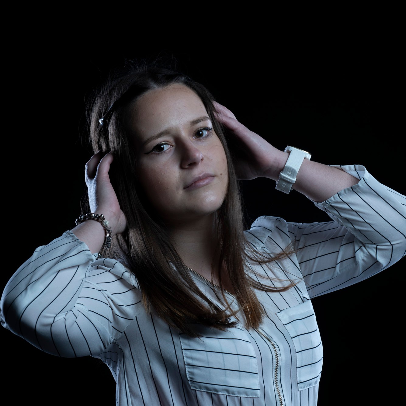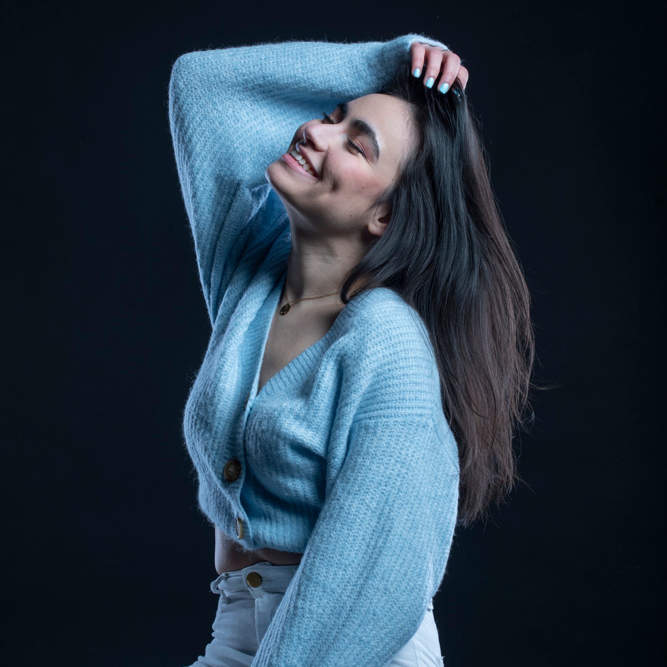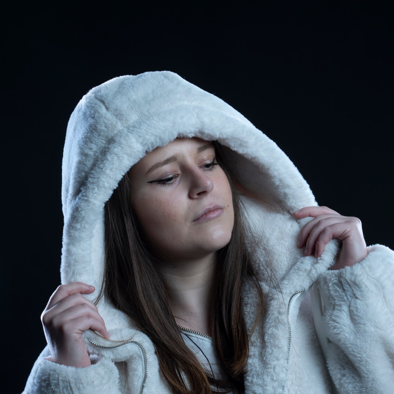 Studio photographs with a really beautiful, photogenic and nice model. With style. She has shown up with all black clothes, which basically got to the idea of an all black photograph, which I still think is one of my most successful and my favorite photo ever taken. Huge thanks to her for most amazing photos and amazing mood. She is really fun to work with, always in great mood to make yours the same. Amazing photo-shoot that I remember like yesterday (year taken: 2021).